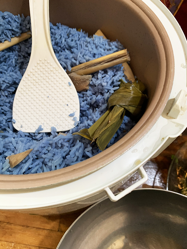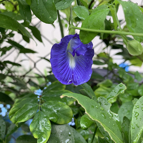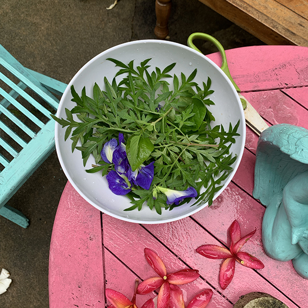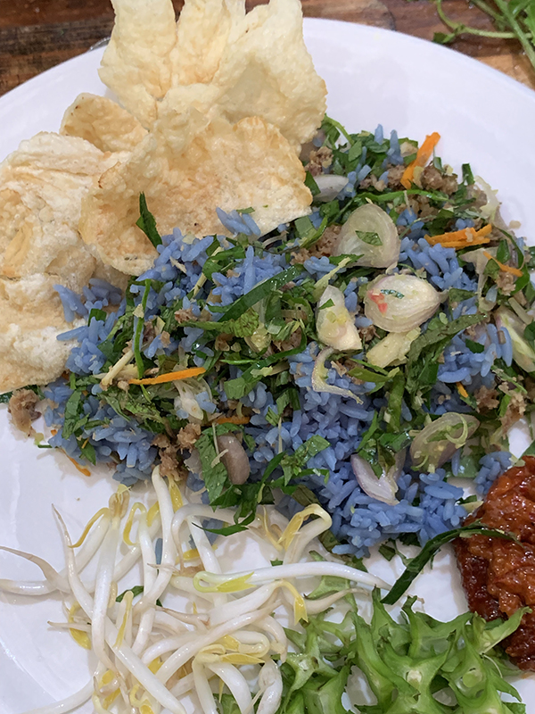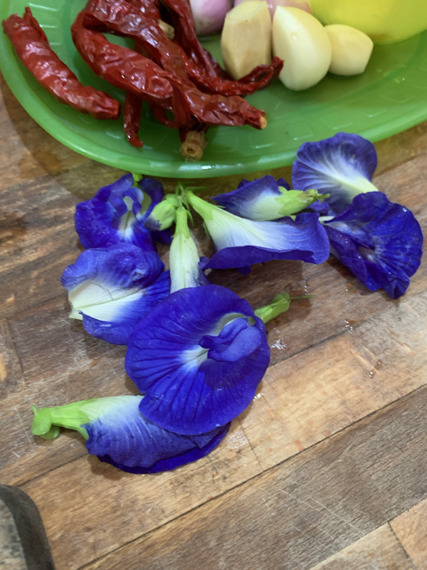 This gorgeous Butterfly Pea Flower was picked for decoration and the dried version is soaked in water to give rice an amazing blue color. It has no flavor, but the color is a nice contrast against the green of all the fresh herbs used.