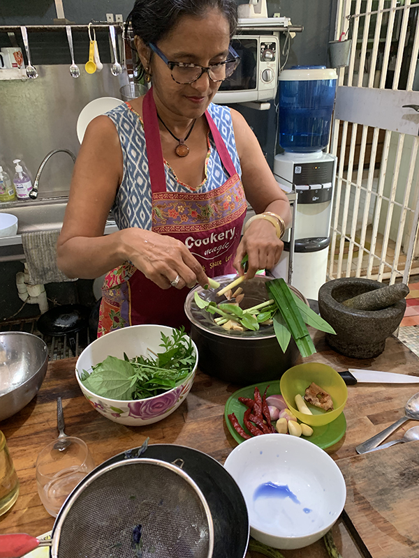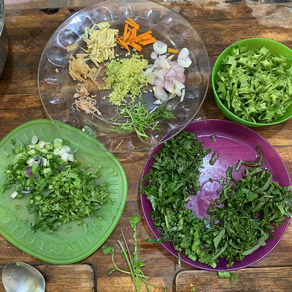 Just a short list of the many herbs we chopped: tumeric, lemongrass, ginger, chinese celery, galangal, ginger flower, ginger leaves, asian pennyworth, mint leaves, kaffir lime leaves, young cashew leaves, wild pepper leaves, wild cosmos, coriander leaves, thai basil and turmeric leaves.