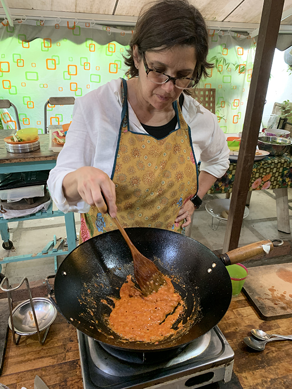 My friend Sharon stir frying the spice paste (shallots, garlic, bellman and lemongrass) and oil until it separates from the paste for the Sambal with fish, prawns and roasted coconut.