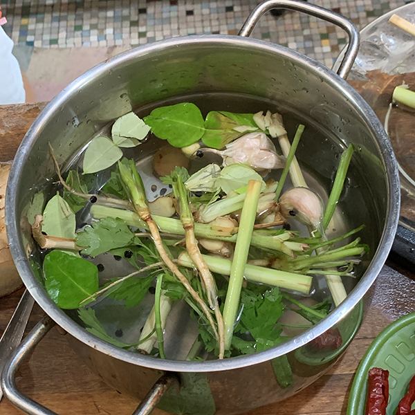 Chicken stock with spice paste, water, chinese celery, glass noodles boiled then simmered.